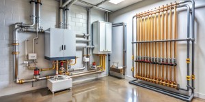 Standard heating system installation in a mechanical room with copper piping. Generative AI